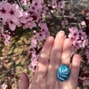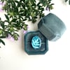 This stunning ring features a cyanotype print and show cases the beautiful contrasting greens that are made via the wet cyanotype process. The botanical artwork has been sealed with resin in a stainless steel ring that has an adjustable double band. The ring will come with the antique inspired velvet ring box, as pictured.